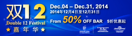 Greater China Hospitality (H.K.) Limited 大中華酒店(香港)有限公司联手携程Ctrip,旗下温德姆至尊豪廷及豪生两大品牌,即将带来新一轮折扣风暴!共计30家酒店隆重推出双12限时抢购,遍及20个城市任您挑选,12月4日至12月31日强力售卖,折扣低至5折!带上家人或是朋友,尽享优惠折扣,圣诞元旦狂欢不停歇! 预订时段:2014年12月4日至12月31日 入住时段:2014年12月4日至2014年12月31日 (部分酒店延长至2015年2月28日) 定金及取消收费政策:遵从酒店设置条款